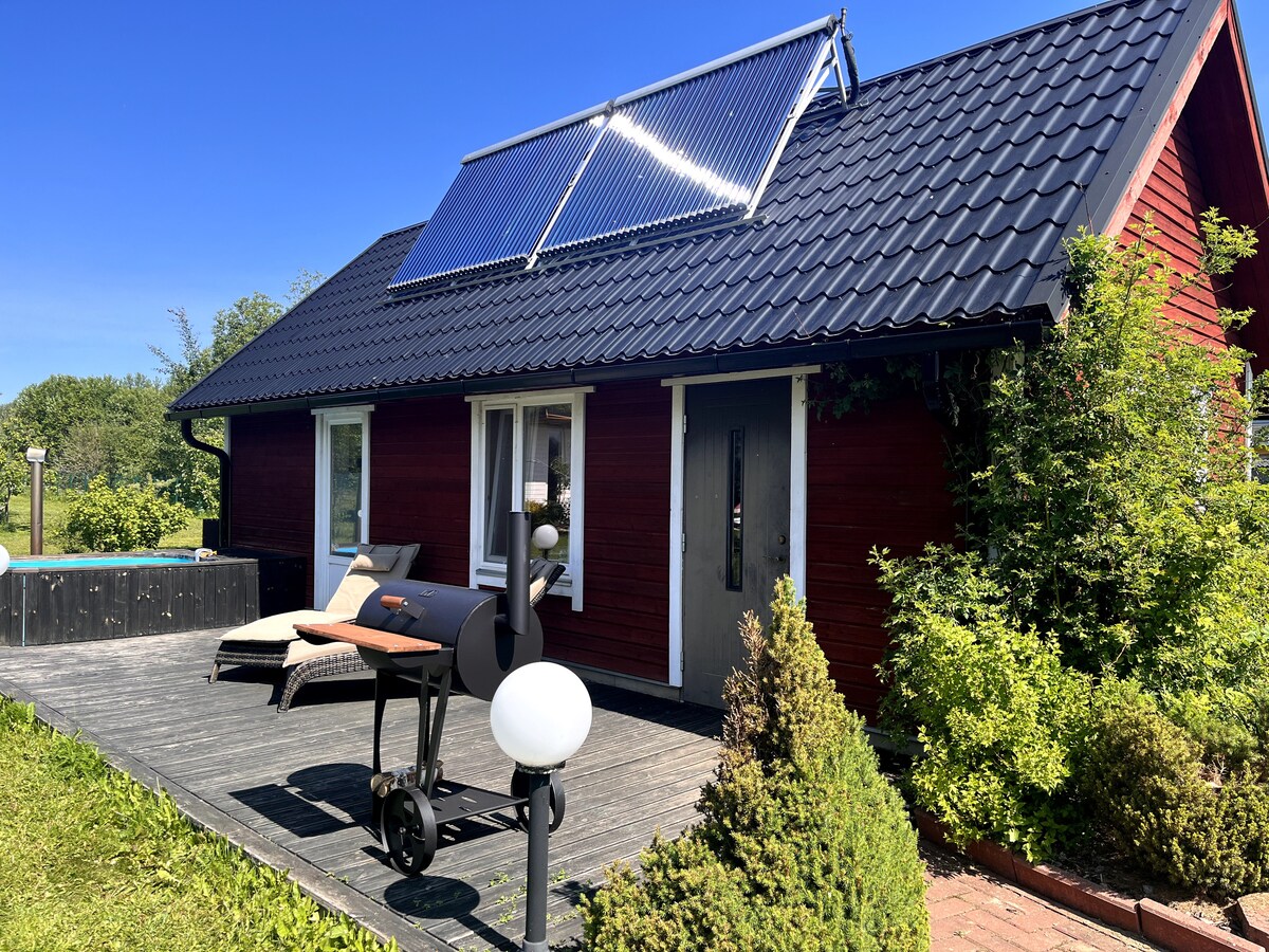 Two-storey house in a quiet place with beautiful nature. Upstairs, a fold-out sofa for 2 beds. Downstairs 2 beds 2+1 beds. Children can use the playground, trampoline and playhouse outside. There is a barbecue option (bring your own charcoal). The accommodation is located a few kilometers from the Air Museum and Lange karting track. The family lives next door. It is also possible to rent as a party room by agreement.