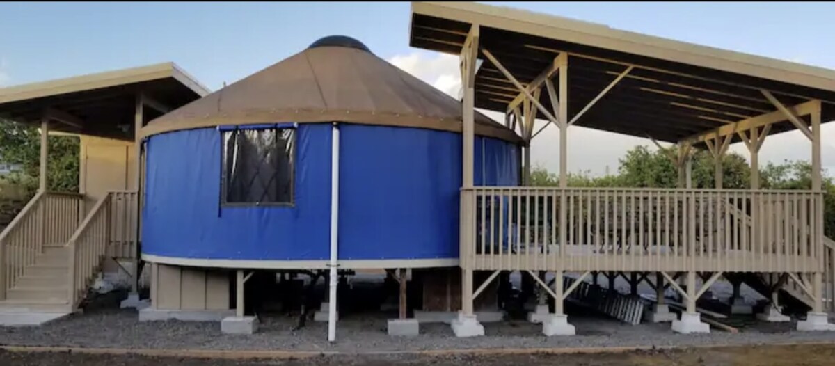 Yurt experiences up on a terrace with amazing views, sunsets and rainbows skies and starry nights. Private deck and separate building host two bathrooms and shower. Halfway between Kona and Hilo and one hour away from Volcano National Park. Local sites include Kula Kai Caverns, South Point, Green sands beach, Puna luu (Black sand beach)