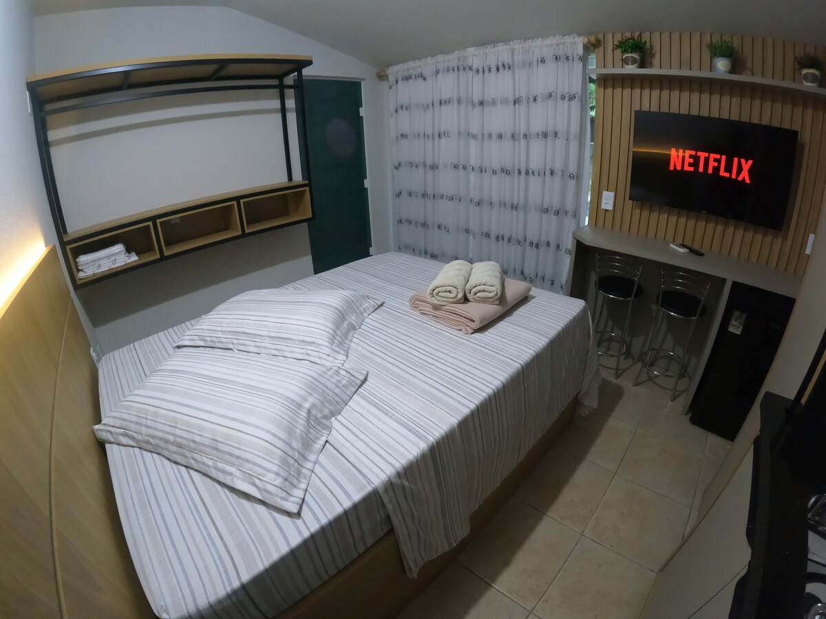 Este studio é um conceito moderno para quem gosta de ter um espaço integrado e prático para o dia a dia, é a hospedagem ideal para quem procura um espaço para descansar e relaxar, ou ainda fazer home office. Fica aos fundos de nossa casa com total privacidade e conforto. Além disso, disponibilizamos toalhas de banho, roupa de cama e cobertores. Possui cama de casal e uma de solteiro auxiliar. Banheiro amplo e privativo.
