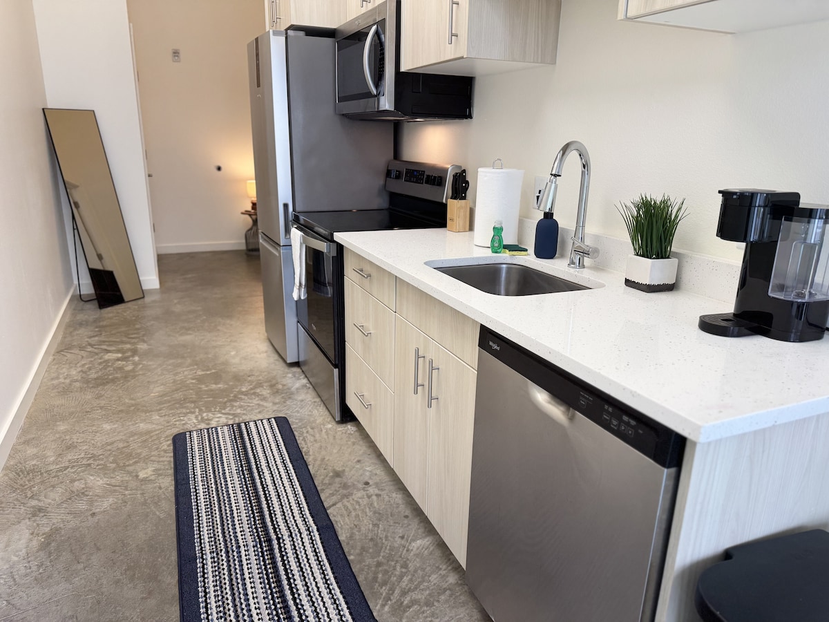 Brand new apartment, fully equipped, inside a charming residence. Private, gated parking included. Just steps from downtown restaurants, shopping, and nightlife. 1 Bed, 1 Bath, with a queen bed. The apartment comes with WIFI and smart tv for play. There is a brand new gym with 24 hour access onsite! Brand new kitchen appliances and every utensil needed to cook. No need to find a laundry mat, there is a washer and dryer located in the unit.