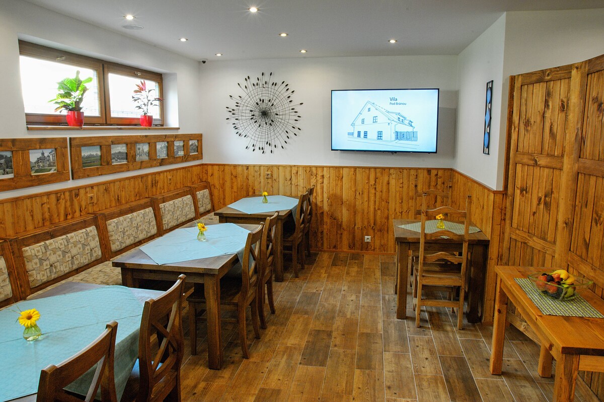 Apartment A - two private double bedrooms with private kitchen and bathroom. Guests could also use shared dayroom with fire-place, terrace or wellness situated in Vila Pod Branou - about 200 meters towards Spisska Sobota square. In every room guests could find „Guestbook“, written also in English, which contains basic information about penzion, offered services and free-time activities in this region. Extra services like breakfast or wellness is not included in the price.