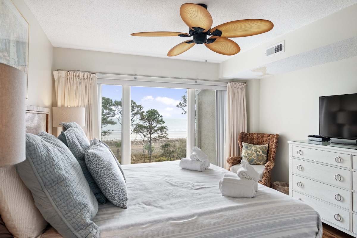 ☀️Time to BOOK YOUR HILTON HEAD ESCAPE. Wake up to sweeping oceanfront views from this top-floor Breakers villa, where sunrise steals the show. Watch dolphins & sip morning coffee on your private balcony, then walk just steps to the beach, pool, restaurants, and shopping at Coligny Plaza—no car required. Perfect for a romantic getaway or small family vacation, with exclusive deals on bikes & dolphin tours. This bright condo offers unbeatable location, privacy, and a stress-free island stay. 🐬🚲