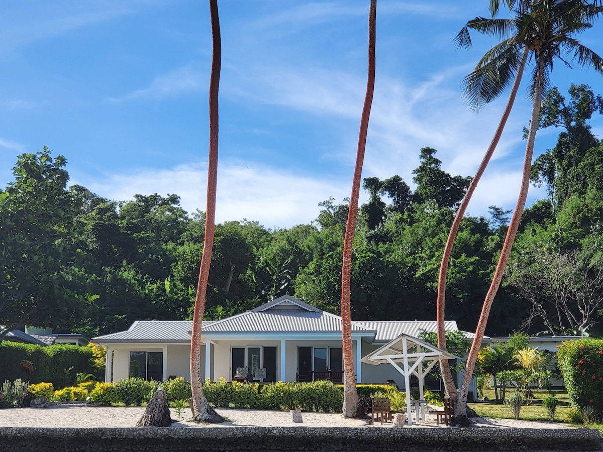 An absolute waterfront beach house with tropical living at its best. On the only white sand swimming beach, in an area of calm waters, a short 5-minute drive from colourful Port Vila. Uninterrupted views of the azure waters of the Pacific Ocean, with spectacular sunsets. Swim, snorkel, kayak and fish, less than a few steps from your front door! Child-friendly, safe with fences and a grassed play area. Perfectly positioned in what the locals say is the best location in Port Vila.