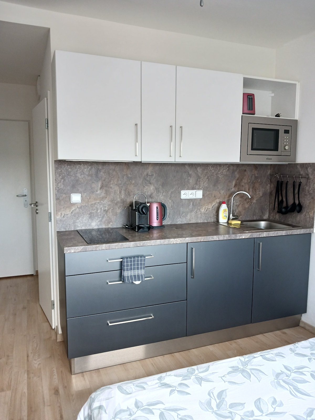 This stylish place to stay is perfect for group trips. Relax and unwind in our elegant design studio in Vinohrady. This cozy space includes a double bed, a kitchenette, and a modern bathroom. Enjoy Prague from the best spot and experience the lively local scene with cafes, shops, and excellent transport links. This apartment belongs to a group of units within the same category. While all units offer the same amenities, there may be subtle differences in color schemes and design elements.