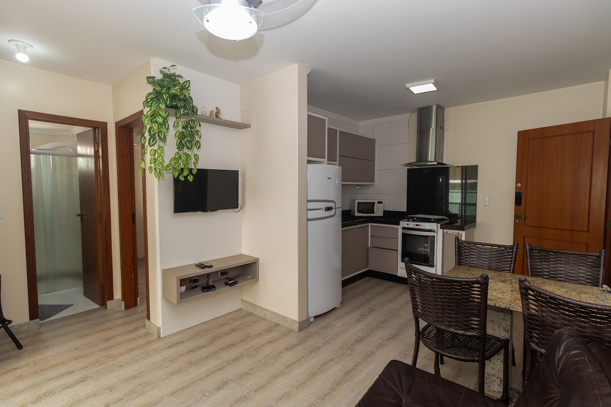 Ideal flat for couples, located just 200 meters from Bombas Beach. It offers a complete experience in a cozy and well-equipped environment. Enjoy the condominium infrastructure with a swimming pool, gourmet area and balcony, in addition to the apartment's comfort: queen-size bed, fully equipped kitchen, air-conditioning, living room, TV in the bedroom and living room, washing machine, bathroom and balcony with barbecue for special moments.