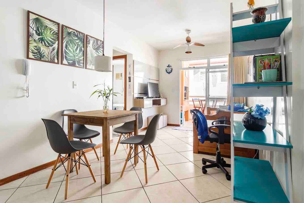 Our space offers comfort and tranquility, located just 450 meters from Canasvieiras Beach! It is also close to restaurants, cafes, bakeries and supermarkets. - Newly furnished - Great Wi-Fi - TV with Netflix - Air-conditioning (living room and bedrooms) - Gas shower - Complete kitchen equipped with all essential appliances and utensils - Washer and dryer. It also has a large balcony with a barbecue area and a table, ideal for eating or having coffee.
