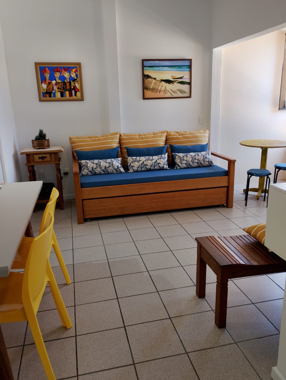 A beautiful view from the balcony to the white sands and turquoise sea of Canasvieiras. With one bedroom, the apartment is furnished and decorated to comfortably accommodate 4 people. Kitchen with basic equipment for cooking and eating. The building is located on the seafront, and the neighborhood's shopping center is two blocks away. You can follow artisanal fishing and buy fresh fish or take a ride on a pirate schooner. Many options for walking, fun and relaxation.