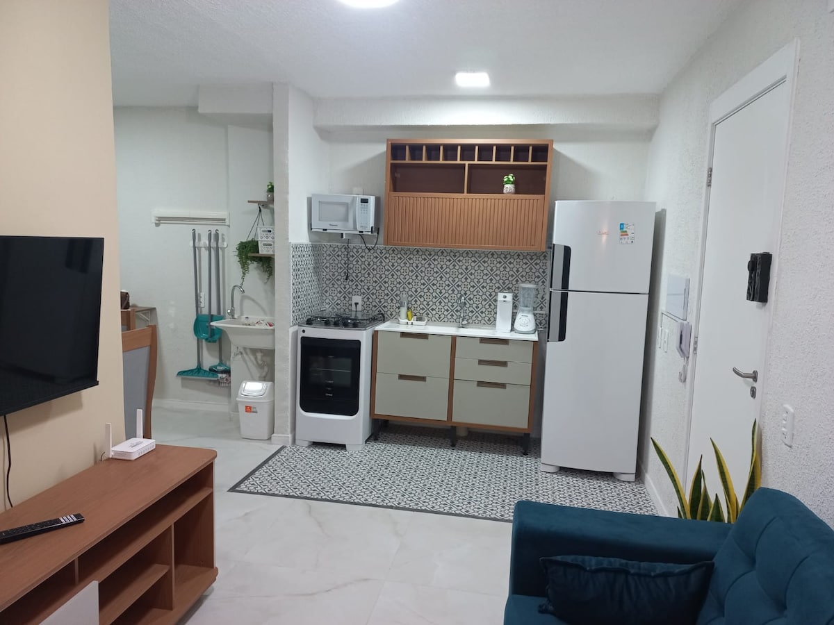 Modern and complete studio in Praia do Futuro. Located in a gated community with 24-hour security and complete leisure! Comfortably sleeps up to 4 people, offering a queen-size bed, split air-conditioning in the suite and a fan in the living room. Kitchen equipped with all utensils, water filter and air fryer, fast Wi-Fi, Smart TV and bed and bath linens included. Enjoy the balcony overlooking the ocean and free parking. Ideal for those seeking practicality, comfort and a seaside experience.