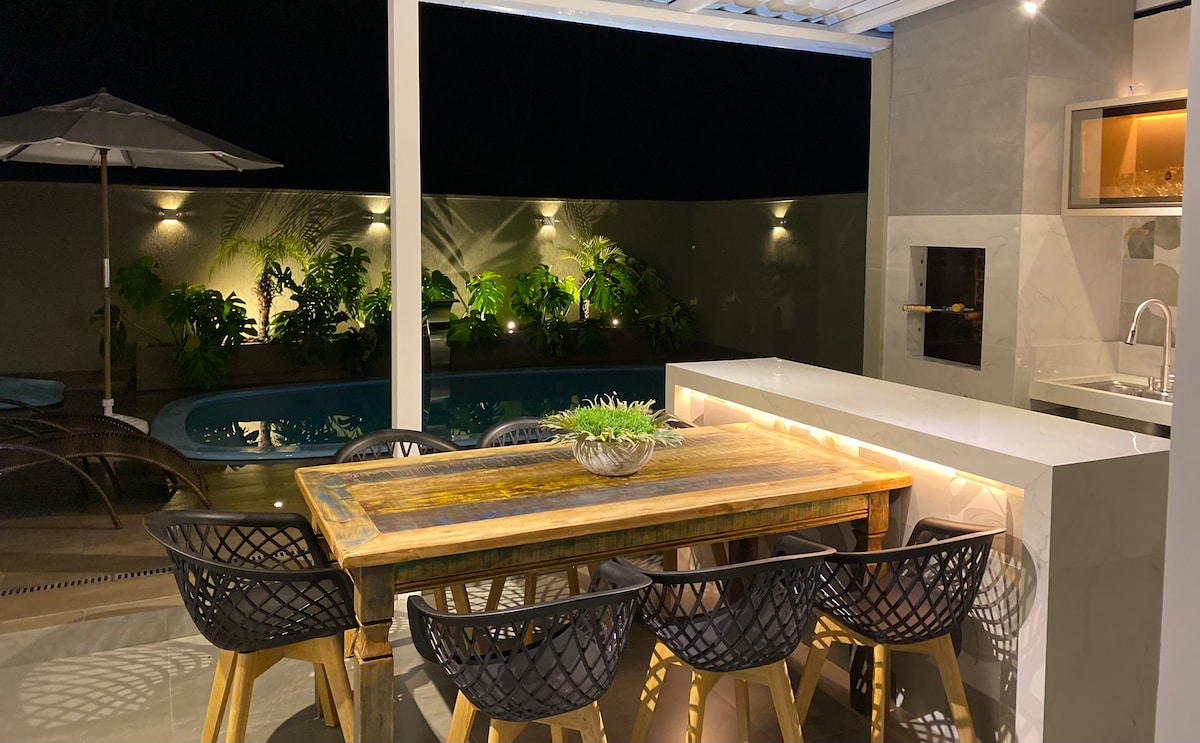 Delicious and family-friendly house in Balneário, high standard, gated community style. House with modern décor, a fresh and fragrant winter garden, and with all indoor spaces air-conditioned. The condominium is beautiful... its structure has small parking lots, multi-sport courts, a beach tennis court, 24-hour concierge, a market, an ice cream shop, and the beach is certainly a sight to behold😍 You and your family will spend wonderful days here! Photos Sep/25 5 minutes from the boarding point for Ilha do Mel and marinas