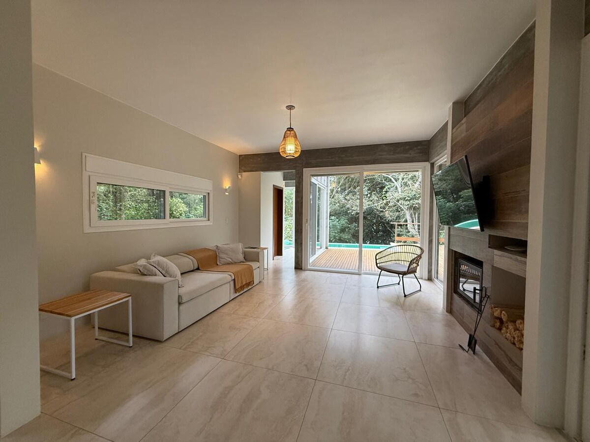 Rustic-contemporary style house. It is ready to welcome guests who want to enjoy their vacation in a quiet and cozy atmosphere. Outdoor area with a large patio with a beautiful Jacuzzi with heating for you to relax. In an open concept, the house has 2 en-suites and a double bedroom with an attached bathroom. In the kitchen, a duplex refrigerator, cutlery, new dishes, cooktop stove, electric kettle, blender, sandwich maker and stainless steel cookware kit are available.