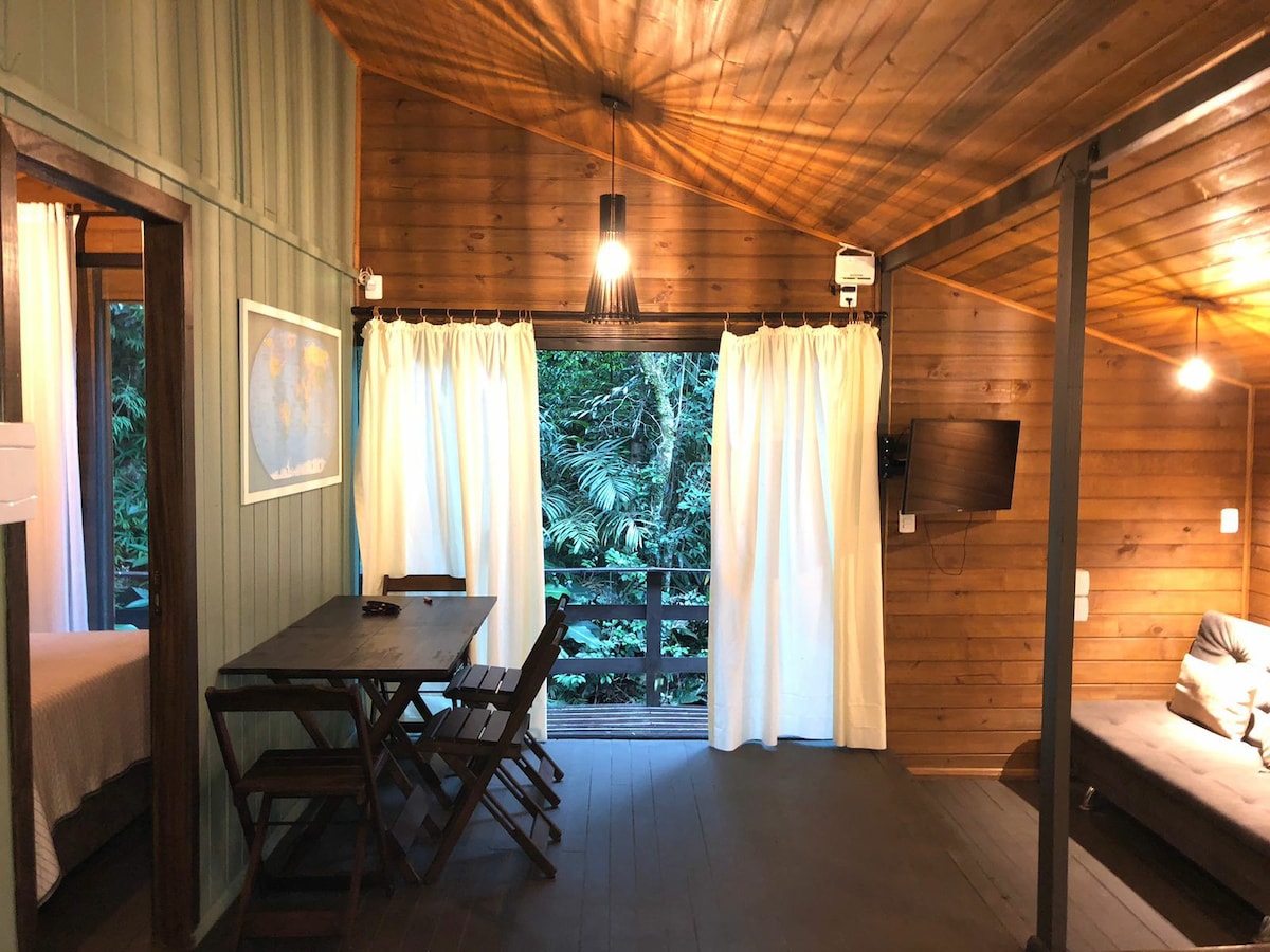 Surrounded by the Atlantic Forest; Spring water; It has signal from all cellphone carriers; It has bed linens and towels; The chalet has kitchen items, an electric oven, a gas stove, a wood stove, and a blender; Access to the chalet is only by trail (150 m ascent), parking before the trail ascent; There is no TV; There is no Wi-Fi; We do not accept pets;