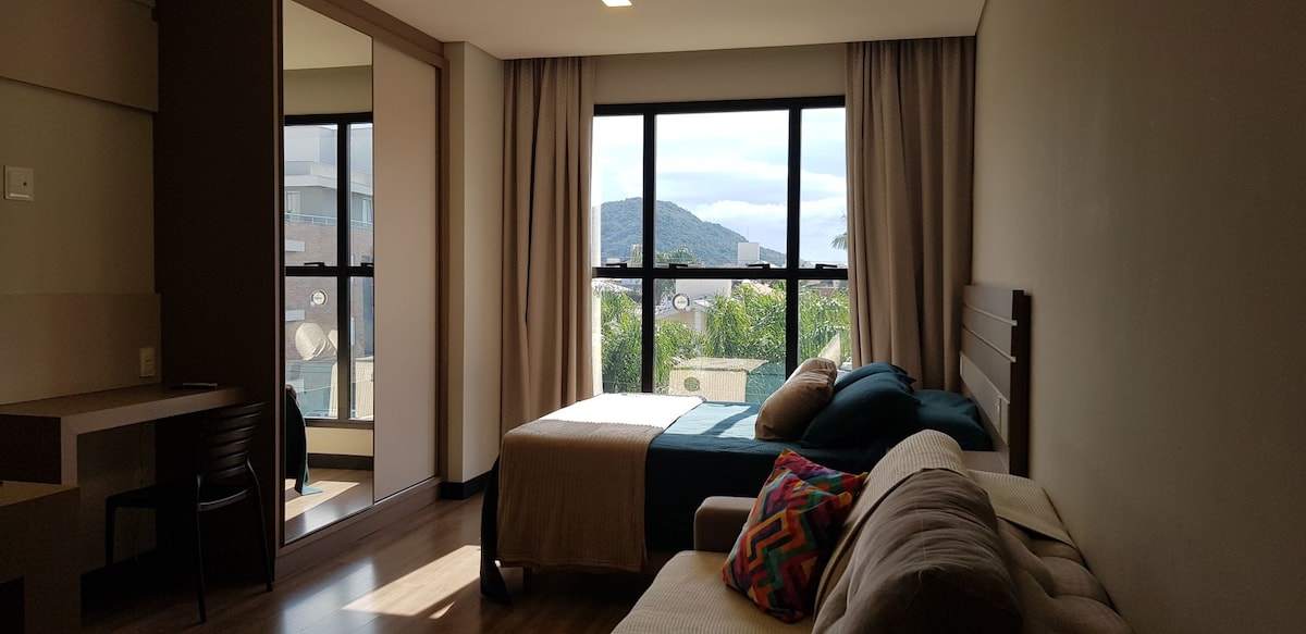 Amazing “foot in the sand” apartment, located 40 meters from Ingleses Beach. Complete, cozy and functional. It has a balcony with a private barbecue area, TV and air-conditioning (heating and cooling) in the bedroom and living room. Tastefully decorated to make you feel at home. The bedroom window has an electric PVC shutter, with thermal-acoustic insulation. It has an exclusive 350 MB internet connection. Condominium with elevator, accessible entrance, game room, adult and children's pool and free parking.
