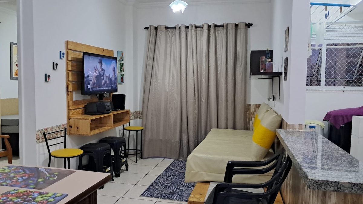 READ ALL THE INFORMATION! ✅The price is adjusted by the number of guests. Kitnet aerated in the Ocian Neighborhood (Praia Grande). The building is in front of the sea and the kitnet has a side view (window) to the beach. It is 15 minutes by Uber from the bus station. Close to bakeries, ice cream parlors, kiosks, restaurants and bicycle rentals. Safe building, with 24-hour concierge, elevator and garage* for guests. ✅The garage is in a garage building 30 meters across the street, 1 minute walk away.