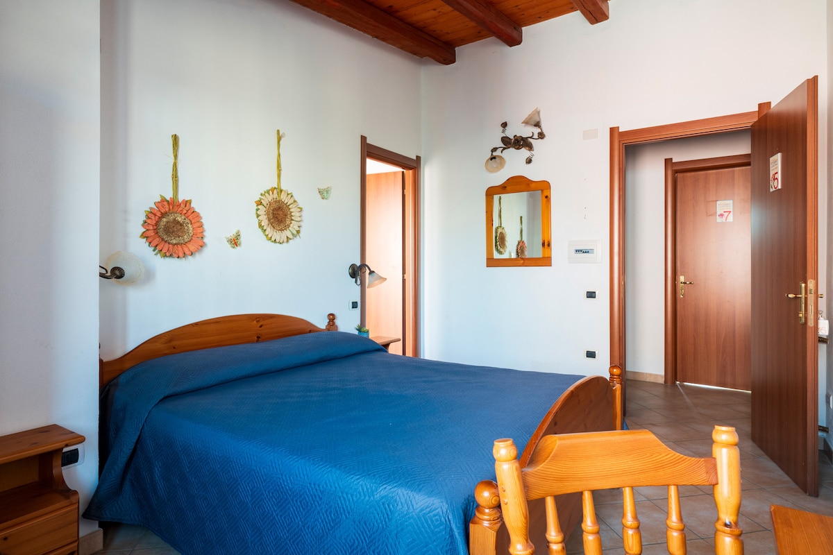 The Girasole room offers a very nice early 20th century style enhanced by a beautiful chestnut ceiling. The room has a double bed with the possibility of a 3rd and 4th bed. A comfortable balcony and en-suite bathroom (with hairdryer) complete the room amenities. Amenities include air conditioning, LCD TV, refrigerator, safe and Wi-fi internet connesisone. It is possible, upon request, to have breakfast service in the bars affiliated with the hotel.