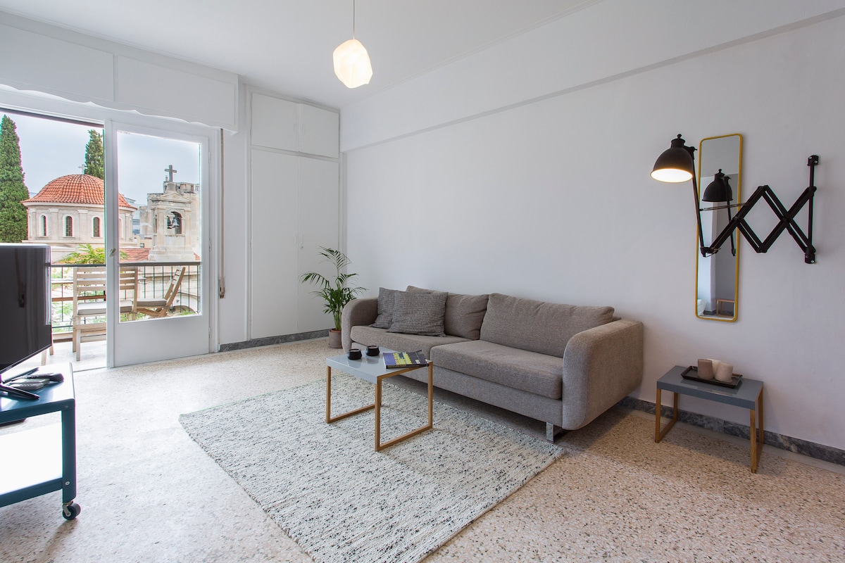 Enjoy a stylish experience in one of Athens' most lively neighbourhoods. Our fully renovated one (1) bedroom flat is located on 4th floor of a residential establishment offering a homey atmosphere, view of the Acropolis from the patio and easy access to the city's most famous attractions. The sunny flat has all necessary amenities for longer stays with the special mattress being the highlight for a comfy sleep.
