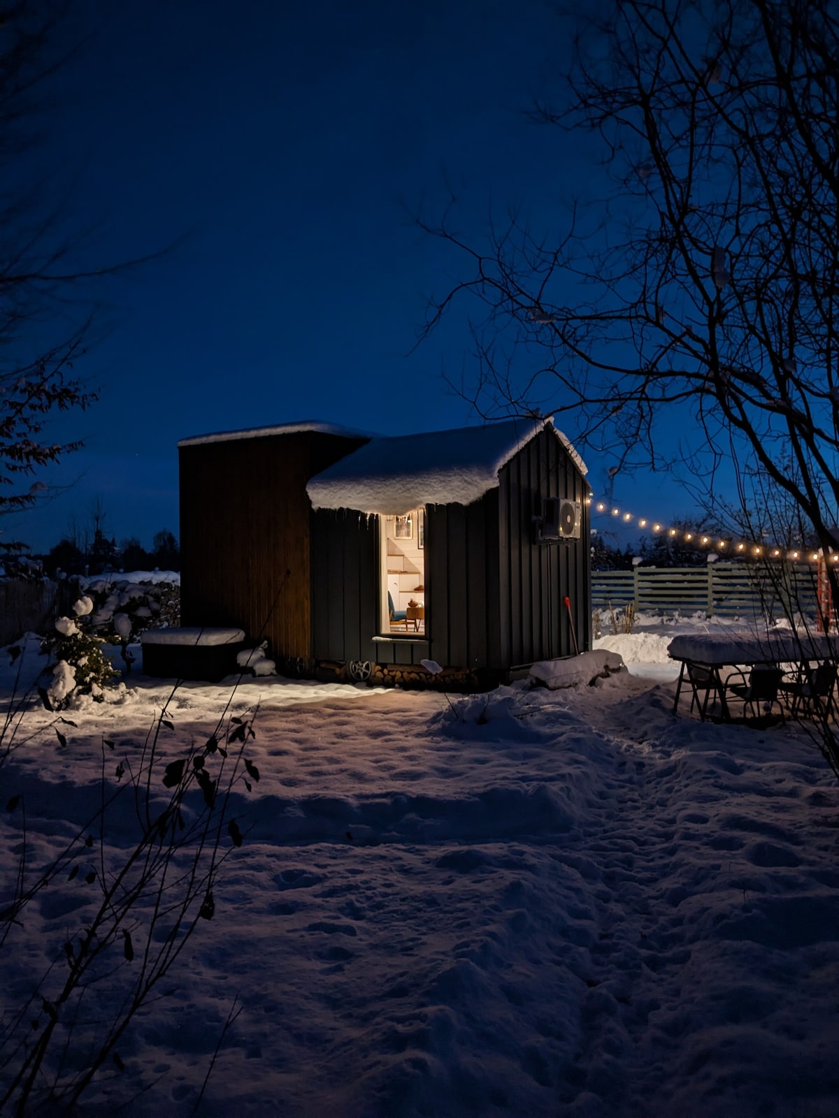Two houses located on a green plot in Mieroszyno, featuring air conditioning, kitchen equipped with a dishwasher, induction hob, and a large refrigerator. The terraces are furnished with furniture and gas grills. Guests have access to a wood-fired jacuzzi and sauna, sun loungers, hammocks, and a fire pit, sports field to play badminton or volleyball. For children- a playground with two zip lines — one of them 40 meters long — swings, and more. It’s a great base for cycling and hiking trips.