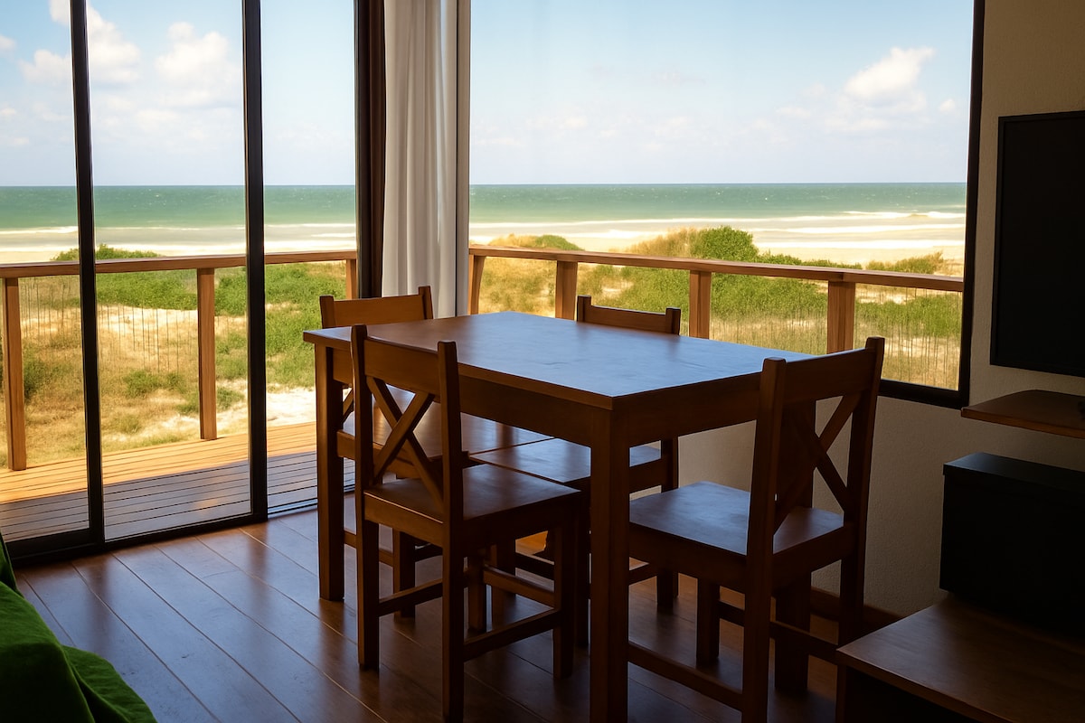 Beach and countryside house surrounded by magical nature. Located 13 km from La Pedrera and 21 km from Cabo Polonio. It has 2 bedrooms, 2 full bathrooms, a kitchen, a living room, an outdoor grill, a laundry room, and large decks with tables. Ocean views from the living room, kitchen, and both bedrooms. From the living room you can see the sunrise at sea, and from the dining room the sunset in the countryside.
