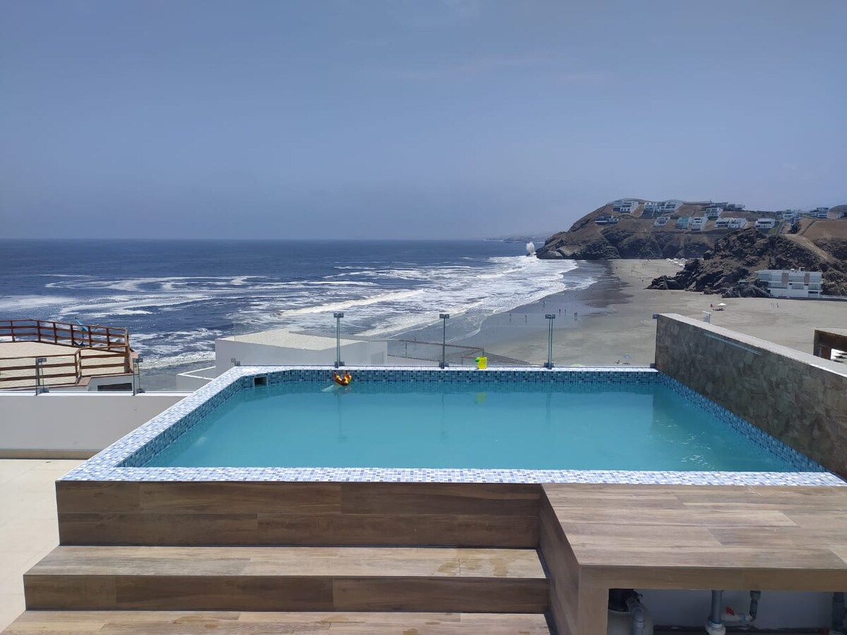 🌊 Hermosa casa en primera fila frente al mar, con acceso directo a la playa y una vista espectacular. Ideal para vacacionar en pareja, familia o con amigos. Cuenta con 5 habitaciones, 4 baños completos, piscina privada, zona de parrilla, horno de barro e internet Starlink. Excelente ubicación: a 5 minutos del muelle de Cerro Azul y restaurantes (caminando por la arena a 20 minutos), a 15 minutos de Asia y a 1 hora de Lunahuaná. Espacios amplios y perfectos para el descanso y la convivencia.