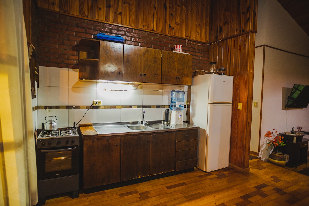 Enjoy this modern, newly built apartment in the heart of Puerto Iguazú. Ideal for up to 4 people, it has a cozy living room with a sofa bed and TV, a dining room for 4 people, and a fully equipped kitchen with new appliances. The bedroom offers a double bed, TV and air conditioning. Enjoy a full private bathroom and relax in the shared gallery or refreshing pool with slide. Your perfect getaway awaits you here!