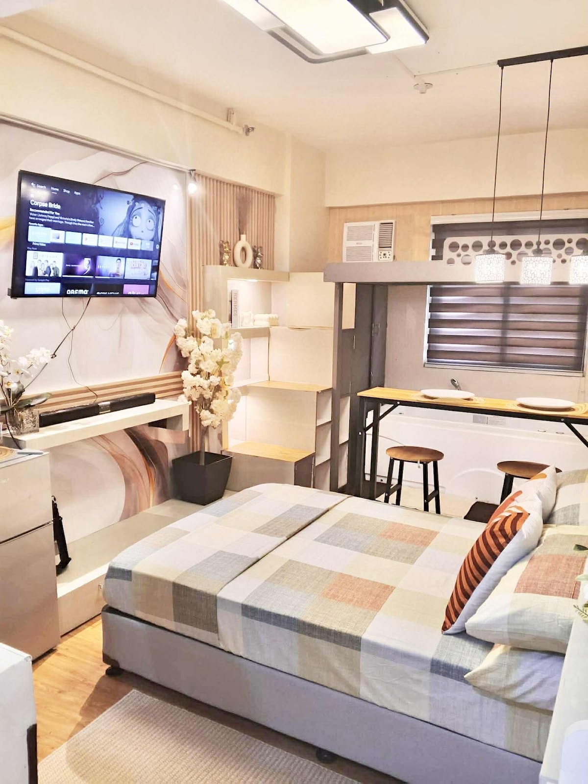 Welcome to The Meydan Suites at Azure North, a Japandi-inspired studio retreat in San Fernando, Pampanga. Just 1.5 hours from Manila, our spacious 2-bed studio comes with a full kitchen, one bath, and a private balcony on the quiet side of Azure. For ₱200 per guest per shift, you can enjoy resort-style amenities including the wave pool, the beach pool, and leisure facilities. It is the perfect sulit escape for couples, families, or barkada.