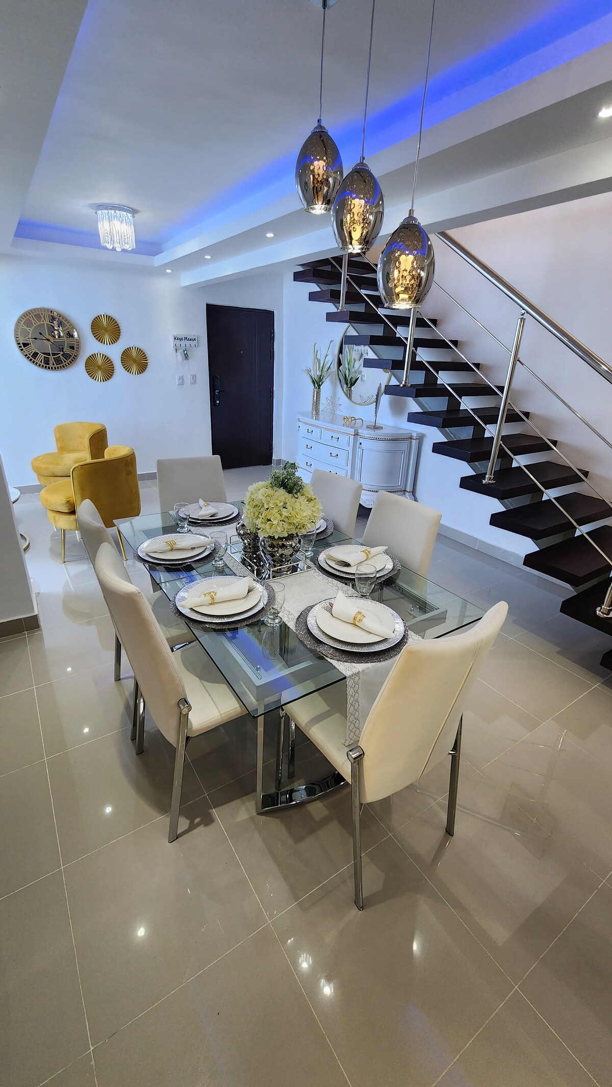*400MBPS Wifi* Exclusivo penthouse nuevo en el piso 10 con 4 habitaciones modernas, bellamente decoradas y climatizadas, 5 Smart TV de 50” y 60”. La habitación principal tiene baño privado. Relájate en el jacuzzi GRANDE climatizado con agua caliente, BBQ y mini bar privado. Su balcón ofrece espectaculares vistas a las montañas de Santiago, al aeropuerto y a la ciudad, creando una experiencia única de lujo, confort y decoración exclusiva.