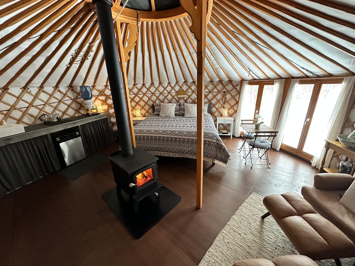 Get away from it all when you stay under the stars in one of our luxury, glamping yurts. Our yurts are the perfect balance between rustic and modern, with our custom made log beds, wood fire place, wifi internet, electricity, and mini kitchenettes. This yurt has a queen bed. All bedding and towels are included, as well as outdoor fire pit. PLEASE NOTE: YURTS MUST BE BOOKED BY NOON ON THE SAME DAY AS ARRIVAL. Please reach out directly if you want to book after 12pm on the same day as arrival.