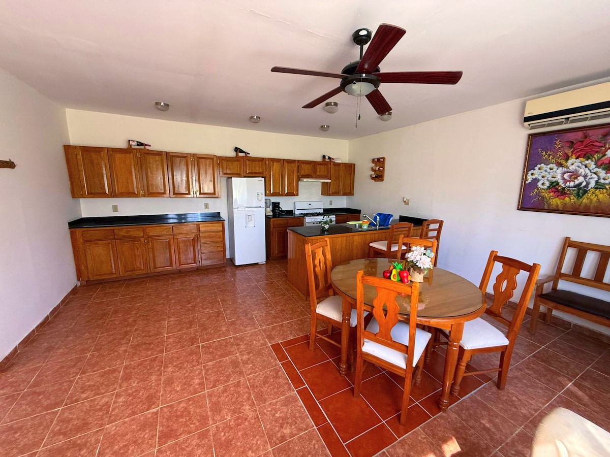 This space (the entire top floor) has an ocean view and breeze with hammocks and ceiling fans. The ac is only in the bedroom. We have now finished the bottom floor of the house, which has its own kitchen and bathroom and has 2 queen beds. That space has a powerful ac to cool the whole apt. If you are traveling with more than 2 people, you can request to rent both spaces, for an additional fee. You can see the pictures of the downstairs space at Casa Limón II. Or just ask me!