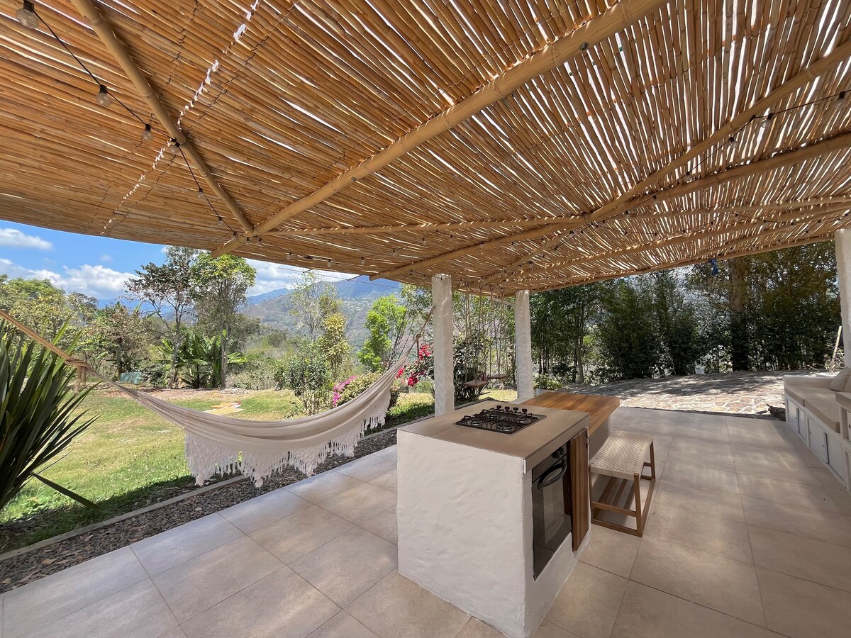 A beautiful country house surrounded by nature to wake up with the birds singing and enjoy its mild climate just 5 minutes from downtown Choachí. It has large green areas and the amenities to have a quiet and comfortable experience: Wi-Fi; living room; 3 bedrooms; 2 bathrooms and a kitchen. 3 terraces with different atmospheres: a covered main terrace with a kitchen, BBQ and oven, a terrace for campfires and a terrace to see the beautiful mountainous landscape. Ample parking