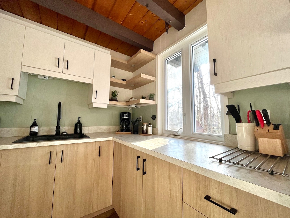 Monumental open concept, in the heart of nature. Access to trails directly behind the house. Wood stove, large modern bathroom, one bedroom + sofa bed. Another sofa bed in the living room. Ideal chalet for a couple with children or two couples. Wild birds, turkey, and deer lovers welcome! Wifi and EV charger included. Dogs Welcome! CITQ : #308038