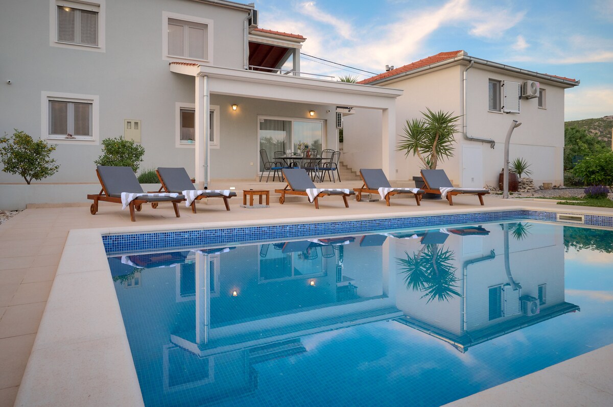 VILLA TISSA with big heated swimming pool, jacuzzi, big garden,free private parking, infrared sauna, mini gym, table tennis and park for the kids with trampoline, swings, toboggan, playstation 4.. House consists of 2 connected objects, fully equipped with a beautiful view at the sea, local islands and mountain from the north side, free Wifi internet connection...