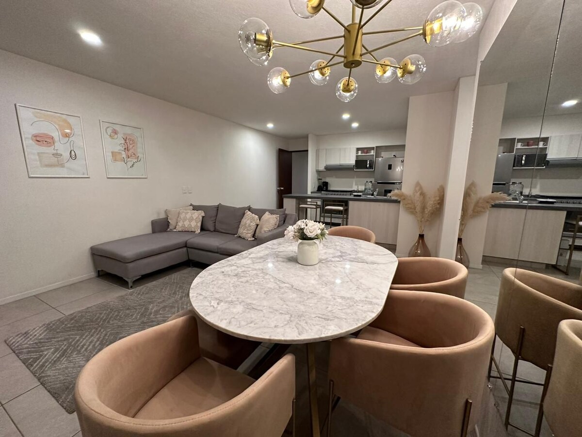 Luxurious apartment in Guadalajara, decorated by designer Fernanda Nisino and with custom-made furniture by Tapatía hands. Stay in one of Providencia's newest and most exclusive buildings, near the financial zone, Bosque Colomos, Punto Sao Paulo, and just 10 minutes from Andares. Exceptionally comfortable space, which has all the amenities and will make your stay incredible. It has 24/7 security and its own parking.
