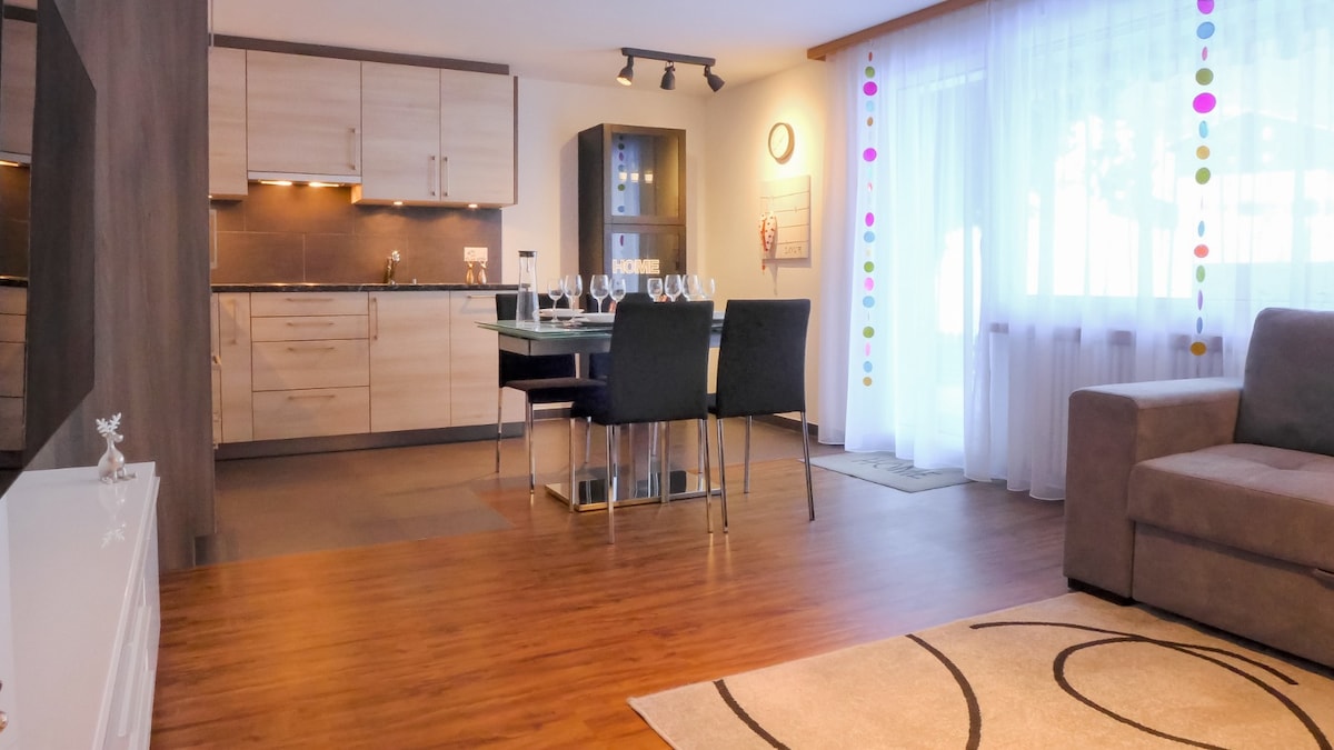 Haus Thor is situated in a quiet area of Tasch, just a short walk from the station. Located on the side of the valley above the village, south facing it offers great views with plenty of natural sunlight The ground floor apartment has 1 large bedroom, an equipped kitchen with dishwasher, microwave. A large living area with dining table and a large sofa. With free private parking, and free internet access there is little else but to enjoy the local area and great views!