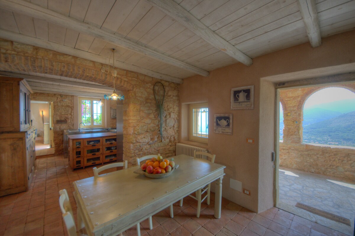Villa Sole is an enchanting villa built with the beautiful and rare stone of Verezzi, surrounded by the green of the Mediterranean scrub and overlooking the gulf with an incomparable view of the sea, the mountain and the Saracen Fortress of Verezzi from which it is 300 meters away on the flat. Convenient to the beaches, it is the ideal place for those who want to get away from the chaos and stress of the city. It has a wonderful garden. Walk in nature trails overlooking the sea and cliffs for climbing. Ideal for bikers