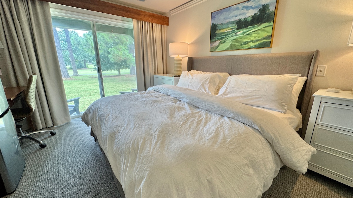 Welcome to your serene stay in the heart of Kingsmill, a private, gated community nestled along the James River. This one-bedroom guest room offers a peaceful escape. Please note, this listing does not include a kitchen or living room. Inside, you'll find a luxury king-size mattress for the ultimate night’s sleep, a remodeled bathroom with a spacious walk-in shower, HD TV and cable for unwinding after a day out, and your own private porch with Adirondack chairs overlooking the ninth fairway.