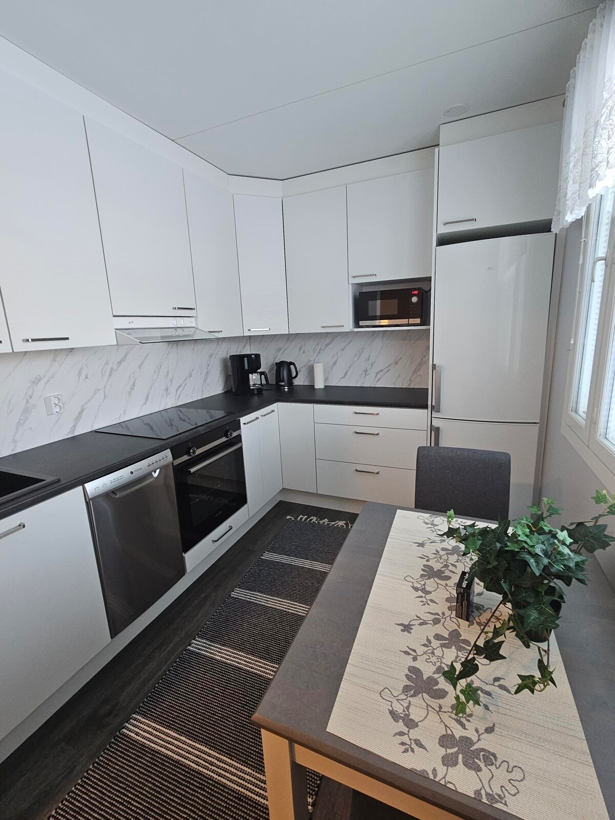 Bright new two-room apartment with good taste, right next to Puuvilla shopping center. The location of the apartment is very central but still without traffic noise. Approximately 1 km to the city center, 900 m to Kirjurinluoto. The apartment has all the necessary appliances and a drying washing machine. Double bed and double sofa bed. If necessary, an extra bed for one person is also available. The apartment has a 55-inch TV, radio and Wifi/fiber optics. Cozy patio with garden furniture and a parking space in the yard.