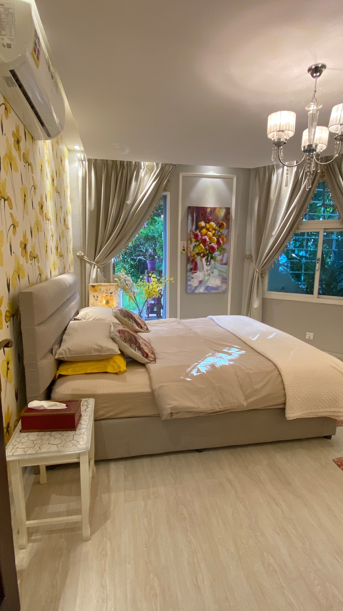 Kick back and relax in this calm, stylish space. A luxurious suite with a full panoramic view of the garden, with berry trees, roses, and grapes, smart access service, in addition to a large modern screen with UHD 4K technology, with a subscription to the iptv service, all the channels of the world, in addition to the channels of Bein Sports, Saudi Sports, showtime, Netflix, and all movies and series, ((and the World Cup😍)) There is a mosque near the residence. Close to Al-Radf Park, restaurants, markets and luxury cafes. There is a tour guide to provide guests with all the places worth visiting.