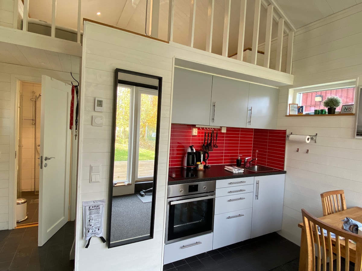 House (25 sqm). Private entrance, toilet, shower cabin & washing machine. The price includes bed linen, towels & final cleaning. One large room with a bed (140 cm), sofa (which can be used as a bed), desk. NO KITCHEN but there is a small refrigerator, micro & water boiler. As a hotel room - larger. Good storage and drying facilities. WIFI, TV with apple TV. Own part of patio. Not shoveled in winter. Parking space - by house. "Trixy" driveway up, due to road conditions.
