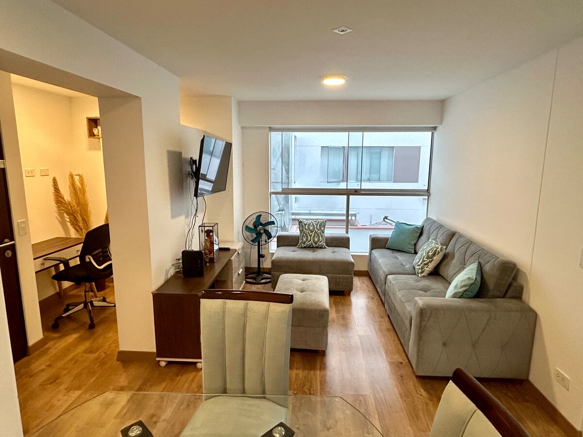 Enjoy an unforgettable experience in this fully furnished apartment located in a central area of Lima, 20 minutes from the airport and 10 minutes from the beach, close to shopping malls (Plaza San Miguel, Real Plaza Salaverry), supermarkets, banks, restaurants. It has 2 bedrooms with closets, 2 full bathrooms, a living room, dining room, fully-equipped kitchen with utensils and appliances, and a laundry room with an automatic washing machine and a hot water heater.