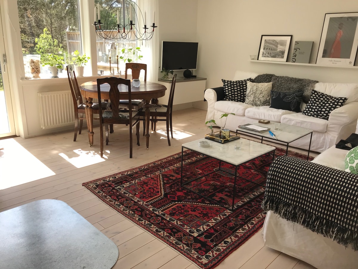 We rent out our guest house next to our villa. With its own private sun terrace, entrance, private parking and barbecue area. Poor transportation, you should have a car. The cottage is in a quiet area with a 250-meter walk to a nice sandy beach and beautiful cliffs. The path is steep, difficult to push a stroller down Here you can sunbathe, swim and fish while the children fish for crabs. Nice hiking areas with bike paths and forest trails. The area offers beautiful nature with many opportunities for relaxation.