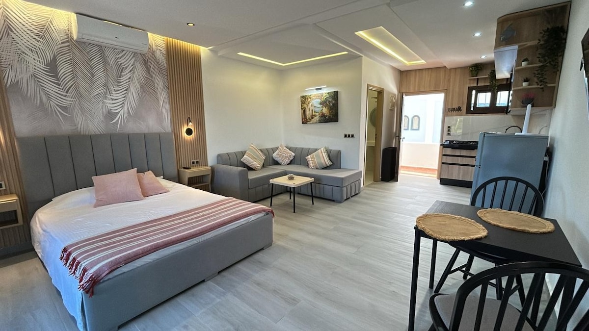 Profitez en famille ou en couple de ce fabuleux studio qui comporte une chambre avec un lit double. Vous aurez aussi une cuisine américaine équipée à votre disposition. Une place de parking gratuite et sécurisée est disponible pour garer votre voiture. Une piscine est également accessible aux résidents de Juillet à Aout. Un accès à une des meilleures plages de la région Tanger Tétouan est à deux pas de la résidence..
