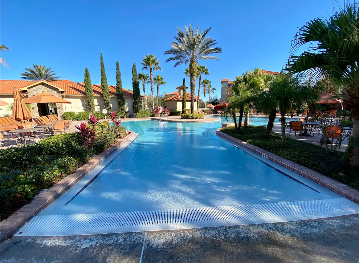 Discover our charming condo near Disney, nestled in a resort-style community. Enjoy complimentary parking and No resort fees!The beautiful clubhouse offers a game room, gathering areas, and a fitness center. Unwind by the serene heated pool or take advantage of the second pool. Engage in activities at the golf cage, tennis, basketball, and volleyball courts, or let kids play at the playground. Stroll along scenic walking trails that wind through landscaped areas and ponds for a tranquil retreat.