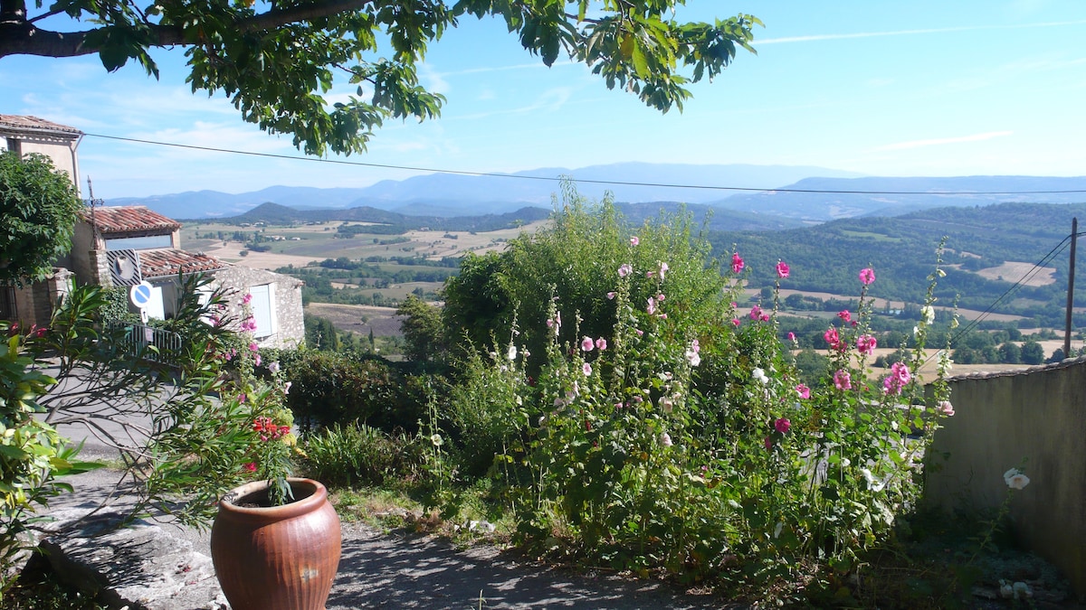 2 SHOWERS + 2 separate toilets. In a medieval village with a lovely view of the Pre-Alps, the south-facing terrace overlooks lavender fields (in July), and a wooded garden (deckchairs and barbecue). Renovated and tastefully decorated (Provençal style). An ideal location for exploring the Luberon, the Provençal Colorado in Rustrel, the Lure Mountains, paragliding in Banon, climbing in Buoux, the Oppedette Gorges, Lake Oraison, and more. Large bookstore in Banon. Salagon Priory in Mane.