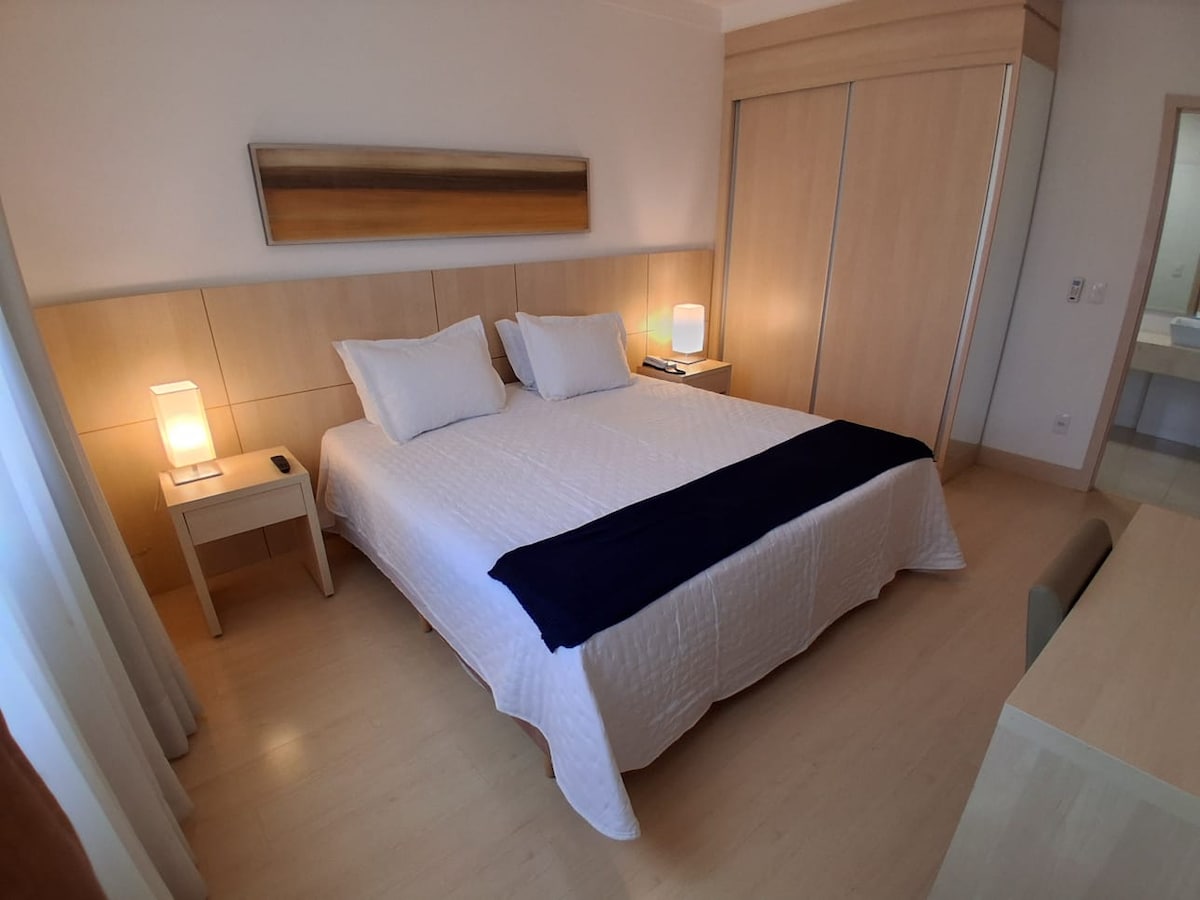 New and modern Studio apartment located in a noble region of Ribeirão Preto, featuring Wi-Fi, air-conditioning, full kitchen, 40' smart TV, BlueFit Gym in the building, Air fryer, parking space and complete leisure area, swimming pool, sauna, game room, gourmet space, coworking space for work, 24-hour home market and the best location in the city, on Avenida Presidente Vargas, 3 minutes from Ribeirão shopping and close to the best parks, bars and restaurants in Ribeirão.