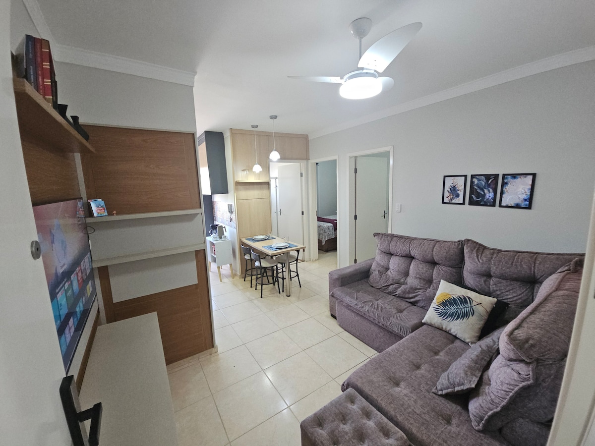 Você vai adorar! Apartamento mobiliado e muito bem equipado, com cama confortável, ar condicionado, sala com Smart TV e sofá cama, cozinha completa com refrigerador, freezer, microondas, fogãozinho elétrico e utensílios básicos. Banheiro amplo e com box. Varandinha privativa. Condomínio diferenciado com piscina e academia. Atendimento personalizado durante toda a estadia.