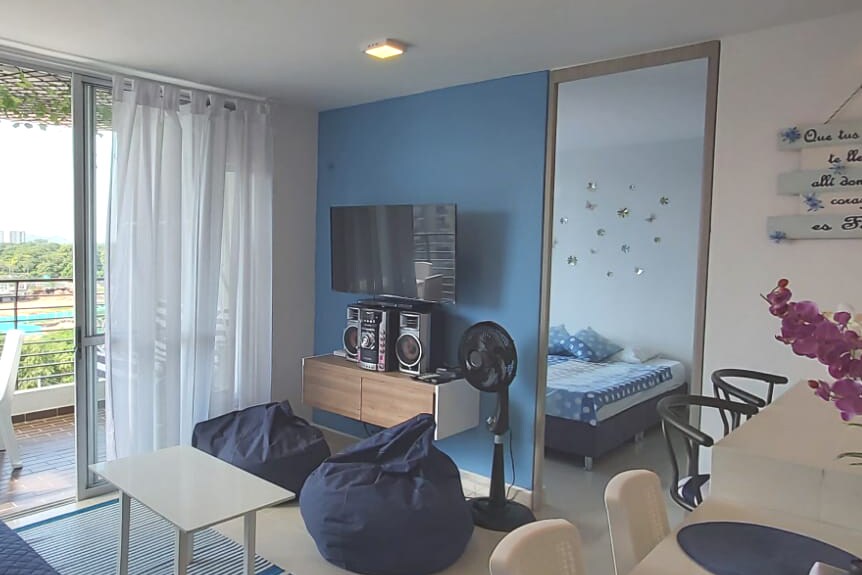 Magnifico apartamento con espectacular vista, completamente dotado. Dos habitaciones cada una con aire acondicionado. Wifi, Smart TV en sala y habitaciónes con las aplicaciones de Streaming (Ingresar con sus propias cuentas debido a las políticas de las plataformas), BBQ gas natural en balcón, hamaca. Conjunto con jacuzzi, piscinas, tenis de mesa, billar pool, futbolín, gimnasio. Complejo deportivo con canchas de tenis, futbol 5, cancha múltiple, parque infantil e iglesias