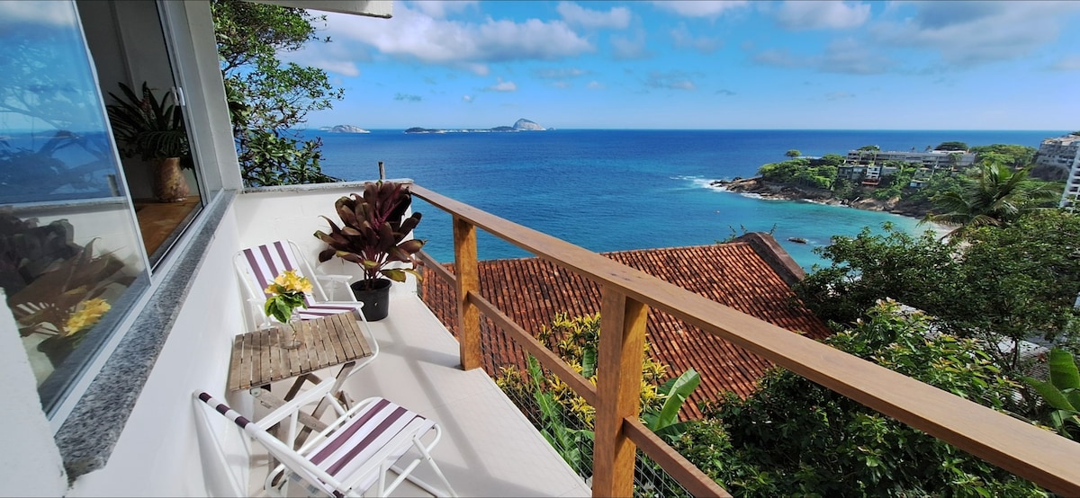 160⁰ panoramic ocean view! Sunrise in front of the window. Great natural light. Ventilated. Blackout curtain. Easy access to transportation. Lower part of the Vidigal community. It is an 8-minute walk to Vidigal Beach, and by car, 5 and 8 minutes to Leblon and Ipanema beaches. Bike path/Av. Niemeyer in front of the house. Double bed, single mattress, hammock. Equipped kitchen: appliances and cooking utensils. Air conditioning. Smart TV Check-in: from 2 p.m. Check-out: 11 a.m.