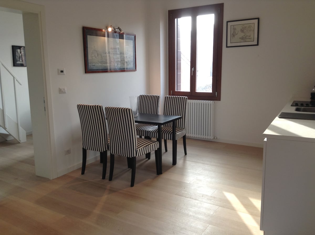 Cozy up with a book, have breakfast and dinner taking in the remarkable view of Venice bell towers and canals, on fantastic rooftop terrace of this beautiful and cozy apartment filled with furniture and ornaments from local artisans and Murano glass factories. Due to allergic problems of the host, it is not possible to stay with pets, sorry for that. Registration Number: M0270428520 The apartment is situated in Santa Croce district, only a few steps from the lively S.Giacomo da l'Orio Square which is renowned for being one of the most picturesque and popular areas of Venice where locals gather to socialise and gossip. The flat is on the third and last floor of a building located in Corte dei Mercanti, a small and cozy square situated about 10 minutes far from the Rialto Bridge and - going to the opposite direction - only 15 minutes far from Venice S.Lucia railway station. The apartment, recently restored, incorporates the concept of a typical Venetian house which reflects both in the furniture and in its architectural structure. While renovating, attention was paid to recreate and maintain the spirit and atmosphere of the Venetian merchants who livened up this area for decades. Furthermore, furnishings are a work of art as it comes from handy work of local artisans and Murano glass factories. The flat offers a 360° view as it boasts windows on each side and it develops on two levels: the main floor where the living/kitchen areas, the bathroom as well as the bedroom are situated, and the upper floor which hosts a relaxing area and a rooftop terrace. The entrance door gives access to the roomy and luminous living area is decorated with three-colour wallpaper and infused by natural light thanks to four windows. The space also includes a comfy sofa, a television and a tea table. Straight ahead, the wide and functional kitchen completes the area. It has classic style custom-made furniture which includes a slate top and details made of pewter. All appliances and a classy wooden table - which seats four - finish the furnishings. The bathroom with shower and a comfortable bedroom complete the main floor. Here, a double bed, a bridge wardrobe and a couple of reading lights furnish the space which is decorated with floral wallpaper and other decorative elements that recall the thousand-year old relationship existing between Venice and the Far East. The ceiling highlights once again the original structure of the building and a lovely skylight ideally extends the room towards the sky. A stairway made of Venetian grey granite leads to the upper floor where, nestled it the eaves of the roof, an air-conditioned reading area finds place. It represents the ideal place where to relax lay on the sofas. The loft also offers a terrace which overlooks the surrounding roofs and bell towers, among which the S.Maria dei Frari and S.Mark's ones. This sunny area is equipped with fine teak chairs and table for four to enjoy unique breakfasts, sunsets, sunrises or a romantic dining under the stars. All the apartment is available for my guests Yes, I, my niece or my cousin will be available during your stay for all info you need and to help you Ca' del Mariner is located on the Corte dei Mercanti, that is a small, cozy square about 10 minutes from the Rialto Bridge, 15 minutes from St Mark's Square and 10 minutes from Venice train Station. The Santa Croce district is the heart of everyday Venice, is the Neighborhood, where Venetians live, far from noisy of touristic flow, but, in the meantime, really close to the main Venetian attractions. Santa Croce district offers a variety of bar, clubs, good restaurants and shops. M0270428520 It is possible to reach the flat by regular water bus getting off at "S.Stae" stop. Here ACTV line number 1 and airport shuttle Alilaguna Orange line stop. This is the closest water bus stop which is located 2 minutes far from the apartment (no bridges to cross). The railway station Venezia-Santa Lucia is easily reachable in only 15 minutes on foot, while Venice bus terminal and parking garages are only 20 minutes far. The apartment has a SUPER WIFI INTERNET CONNECTION 200 MEGA The apartment is decorated with many valuable antique and modern pieces. The owner is delighted to share them with you, but you are asked to respect and take care of them. Smoking is not permitted in the apartment, but it is allowed only on the terrace. Please note that the price does not include the city tax which has to be paid in cash on arrival. It varies according to the number of people, nights of your stay and season (low or high). Moreover, in case of a late check-in after 9 pm an additional charge is applied (to pay in cash only).
