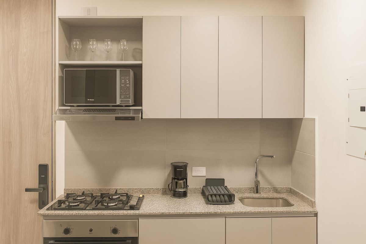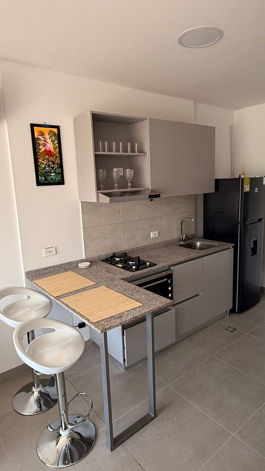 Apartamento completamente nuevo, moderno, con vista espectacular al mar y las montañas Disfruta una estadía única en este apartamento respaldado por NR Stays, luminoso y totalmente equipado, ideal para parejas o viajeros que buscan comodidad y descanso. Ubicado en un edificio nuevo con amenidades tipo resort El apartamento cuenta con una cama doble confortable y una cama auxiliar, cocina integral moderna equipada, barra comedor, escritorio, aire acondicionado y un ambiente relajante