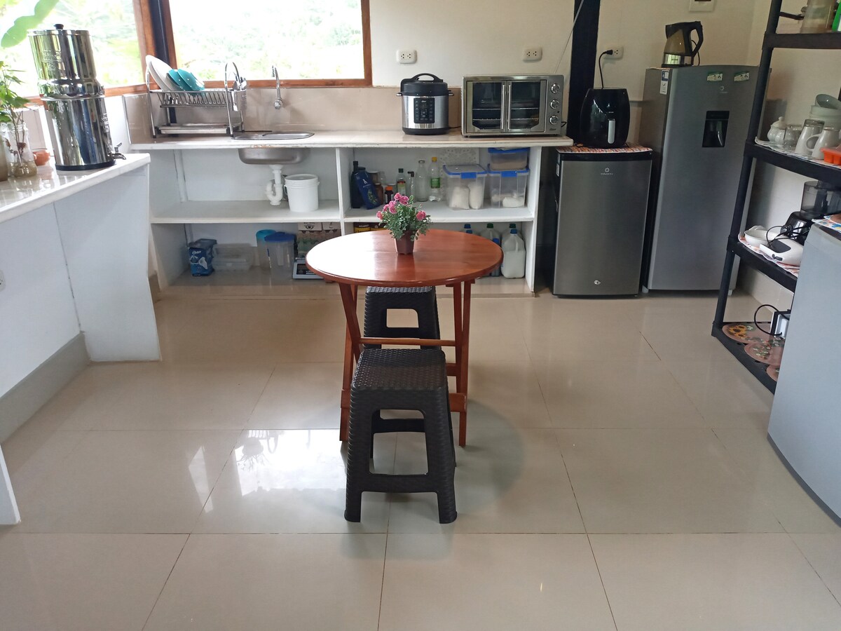 Relax and enjoy a unique and quiet experience. You will feel the absolute peace that only nature can give you, ideal for romantic getaways and those who seek to disconnect from the routine. It has a beautiful view from a private balcony more than 7 meters high, where you can observe and listen to hummingbirds, rock cocks, monkeys and more. A 15-minute walk in the forest and/or 1 hour, you will discover waterfalls and natural pools, with panoramic views and an atmosphere that invites you to relax.