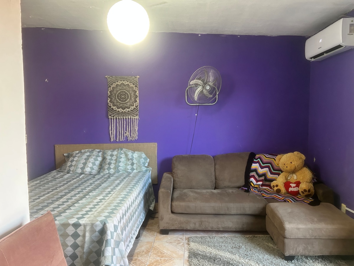 Disfruta este apartamento acogedor y tranquilo, aprox a 3 km de la ciudad. Cuenta con dormitorio principal, un sillón grande, TV y estantería para guardar ropa. Cama marinera con 2 colchones. Cocina integrada, con heladera, microondas,cocina y mesa para 4 personas. La casa está en el fondo de nuestra casa pero con entrada independiente y con privacidad. Garaje espacioso y un patio verde y amplio. Supermercado cerca y parada de ómnibus. Casa para 4 personas